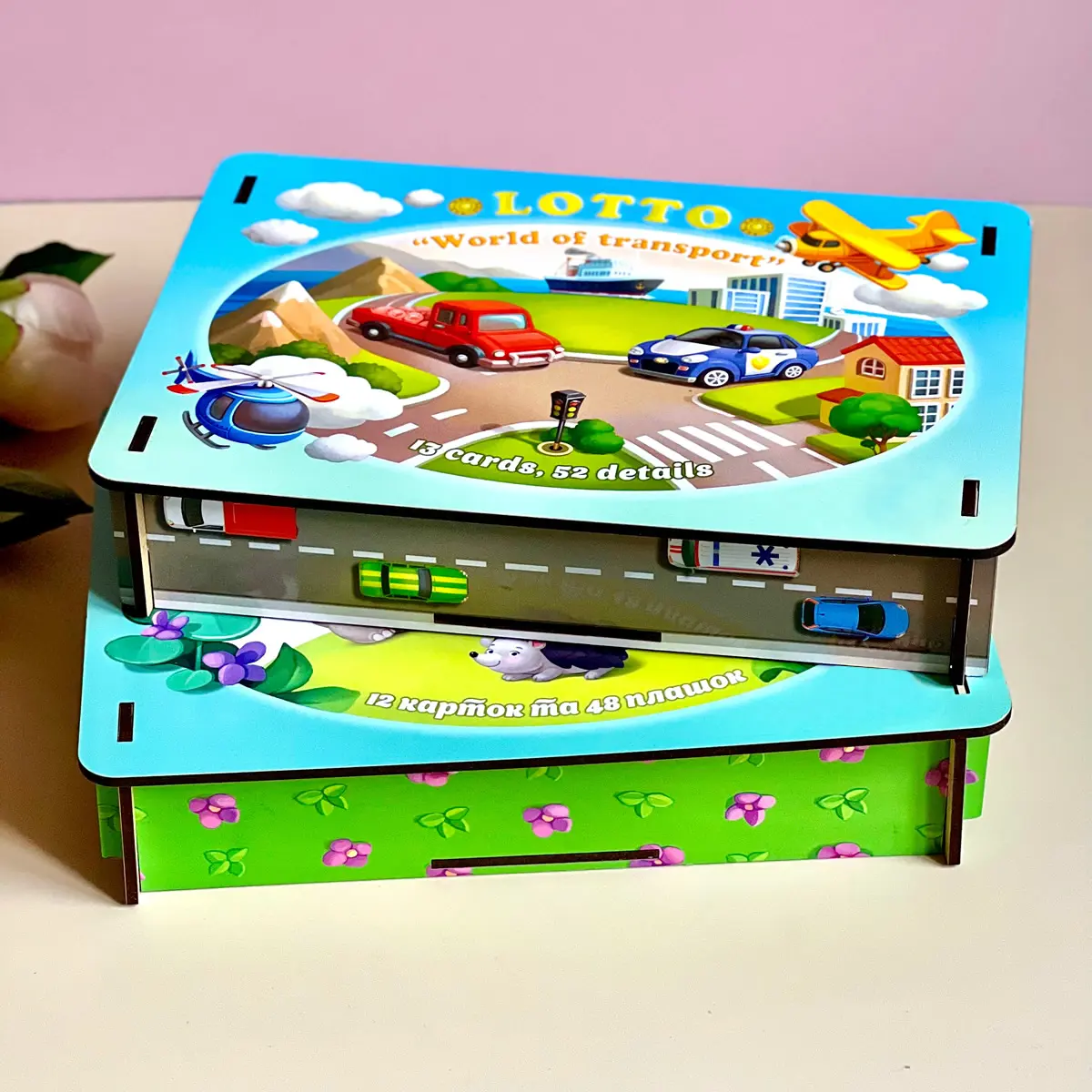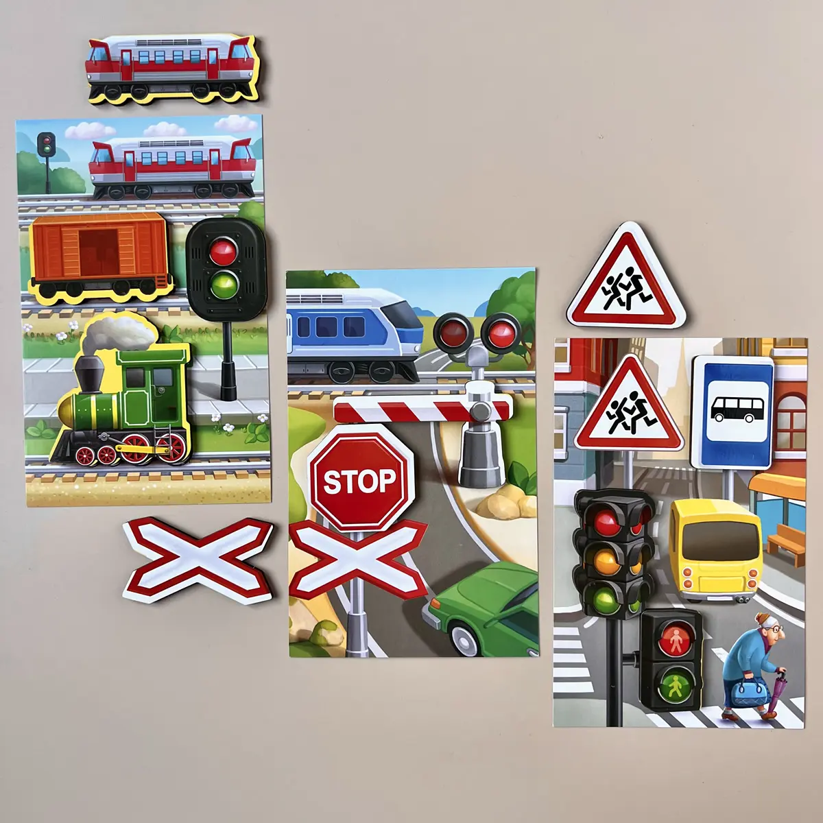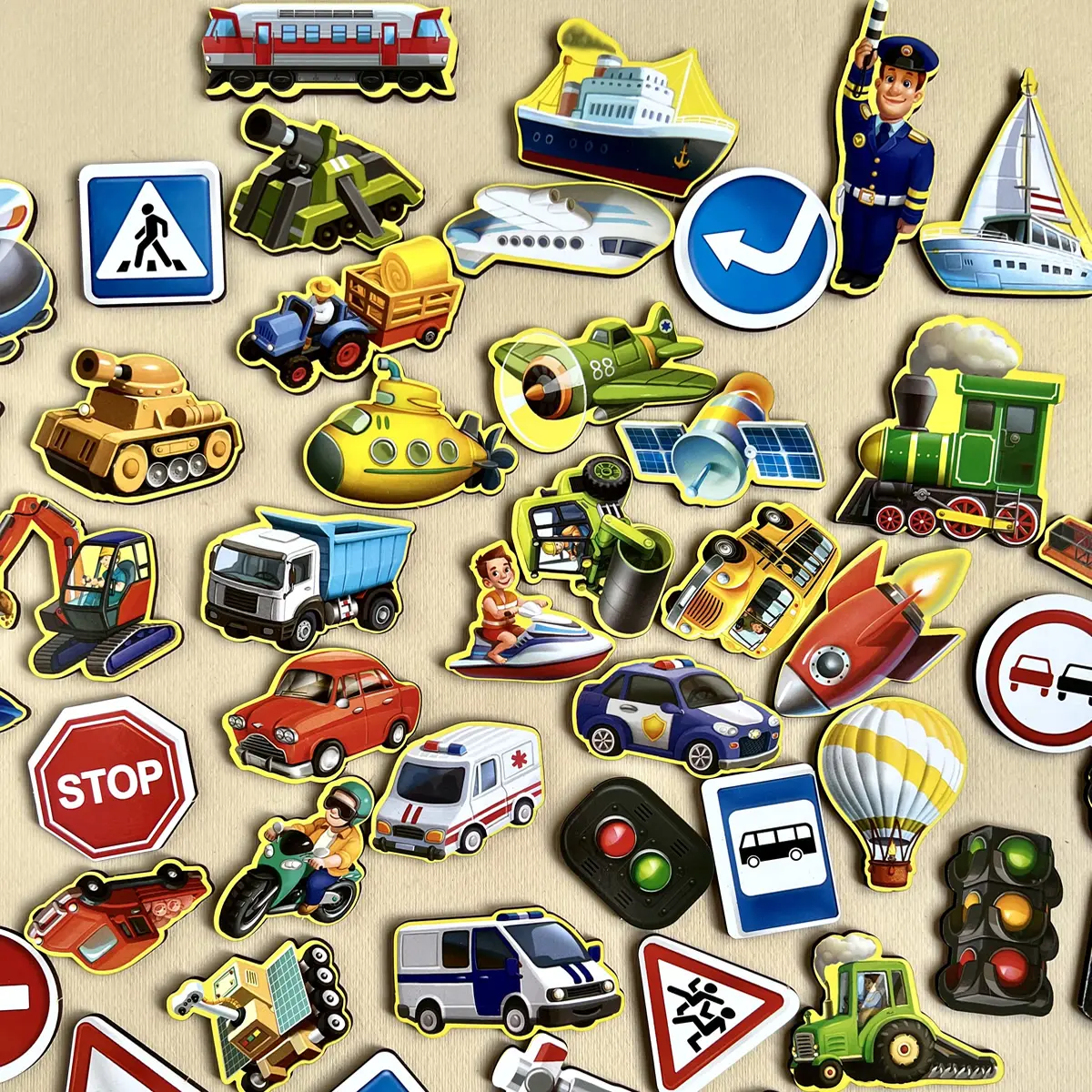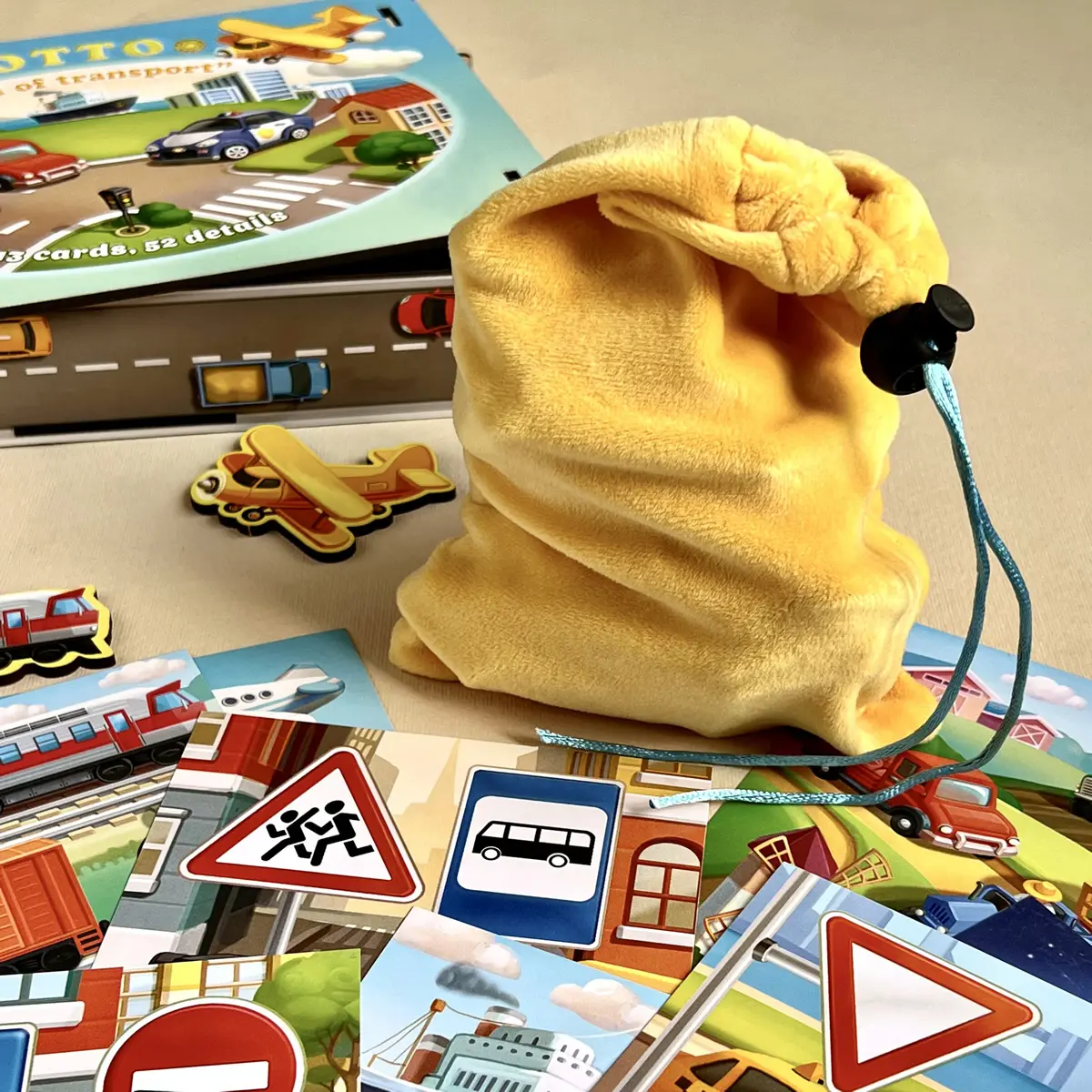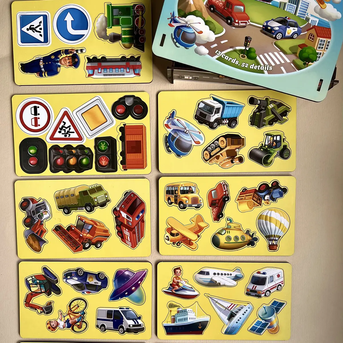 🚗 Vor dem Kind eröffnet sich eine ganze Welt der Fahrzeuge. Heißluftballons, Raketen, Schiffe, Traktoren, Feuerwehrautos, Bagger – sogar Raumfahrzeuge! Jede Holzmarke wird Teil einer kleinen Geschichte. Das Kind beobachtet, vergleicht, erkennt und platziert die passenden Fahrzeuge auf dem Spielbrett. So fördert das Spiel Konzentration, logisches Denken und visuelles Erfassen – ganz spielerisch.